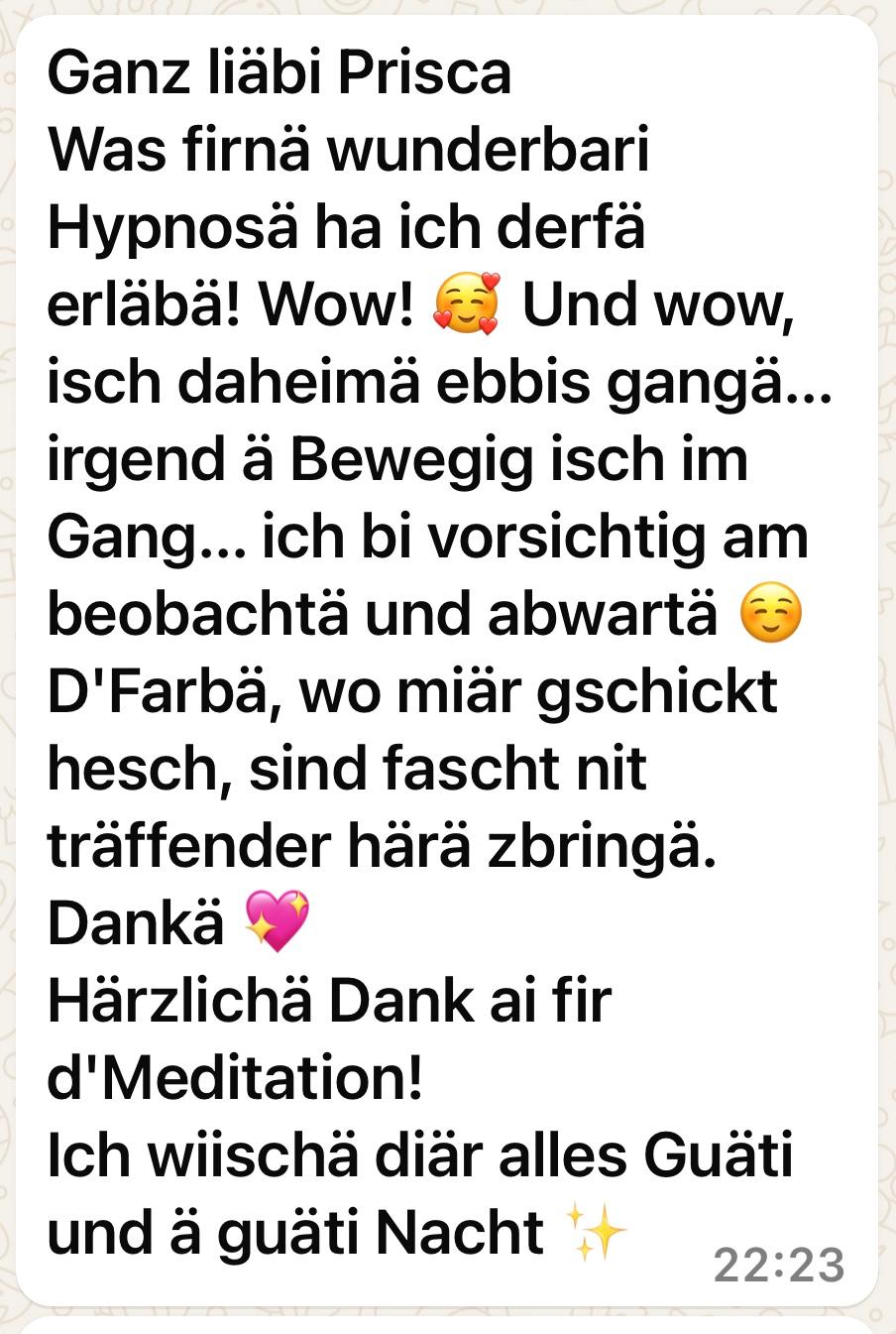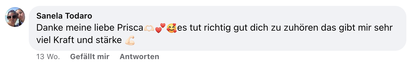 Prisca begleitet durch das «Schreckliche», bis es sich in etwas Wohltuendes verwandelt und seinen Platz bekommt. Es könnte nicht besser sein.